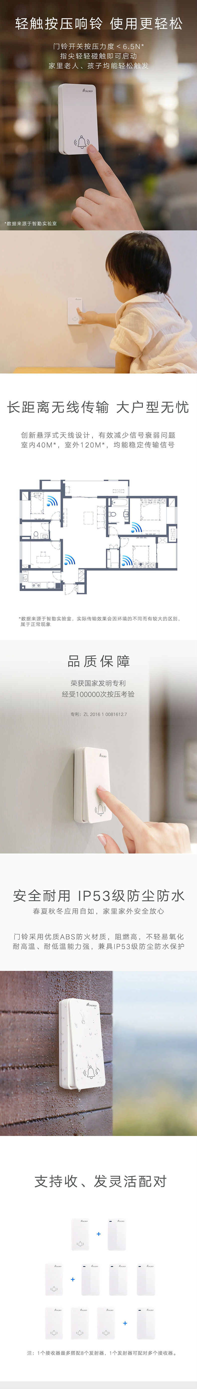 海得曼自发电门铃无线家用超远距离智能电子遥控玲防水老人呼叫器
